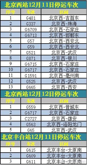 受降雪影响,为确保列车运行安全,铁路部门对京广高铁上下行列车采取限速运行措施,导致途经该区段的部分旅客列车晚点运行。受上述情况影响,12月11日、12月12日北京西站、北京丰台站部分列车停运,已购买停运列车车票的旅客,可于30日内办理全额退票手续。
