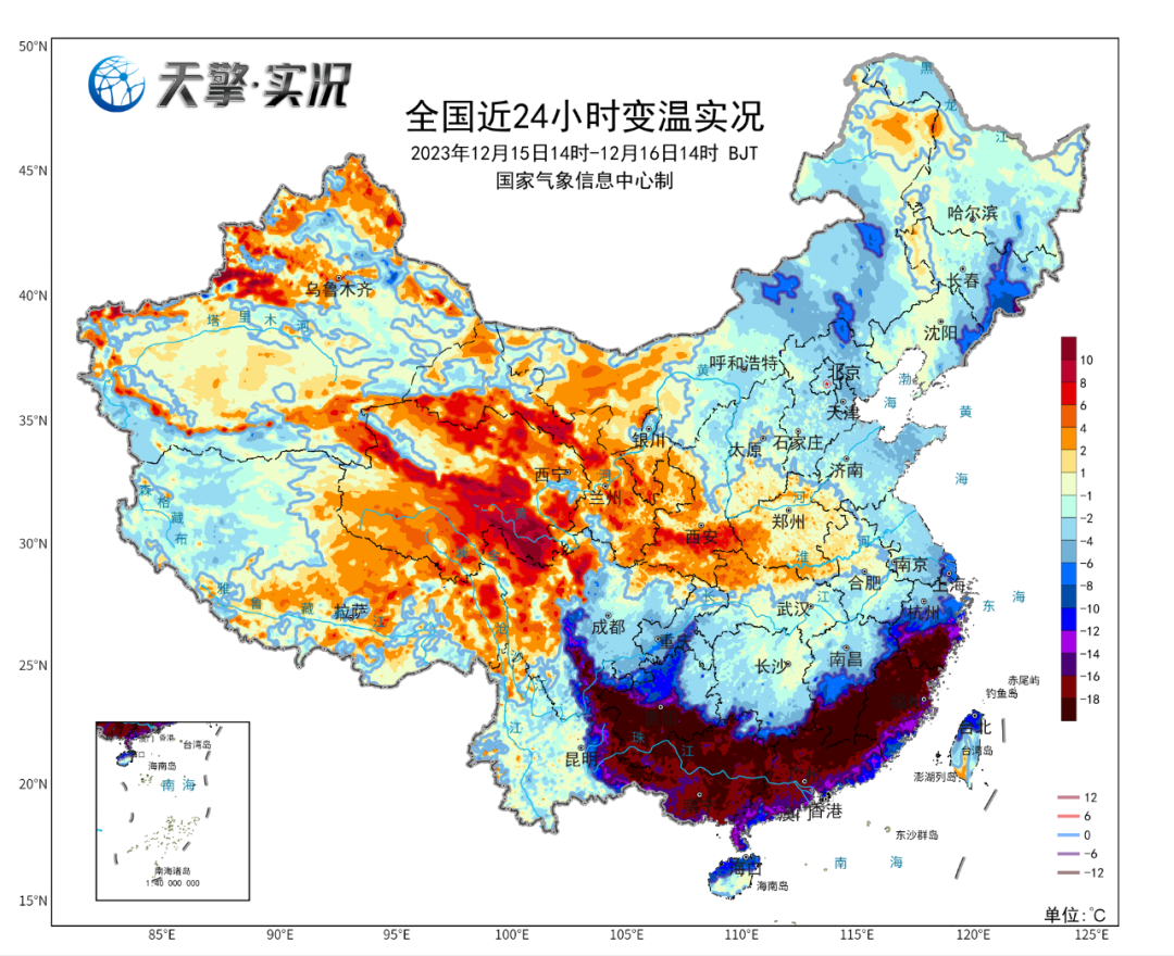大城市里,贵阳降温最为剧烈,降幅达到20.2℃,昨天午后气温还超过20℃,今天就直接降到2.2℃,天气迅速转为寒冷。另外像福州、广州、南宁等地降温幅度也都超过了15℃,广州14时气温只有11.6℃,而南宁和福州均不足10℃。