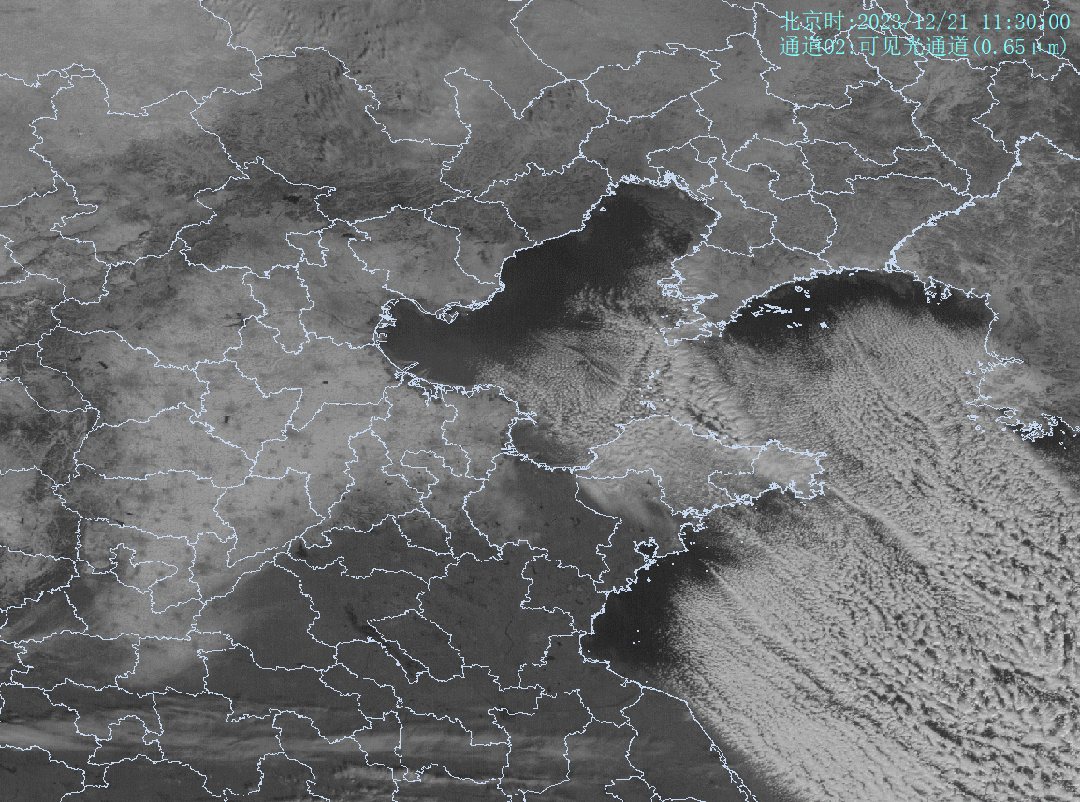 图为12月21日风云四号卫星可见光云图,可以看到大量的云涌向山东半岛