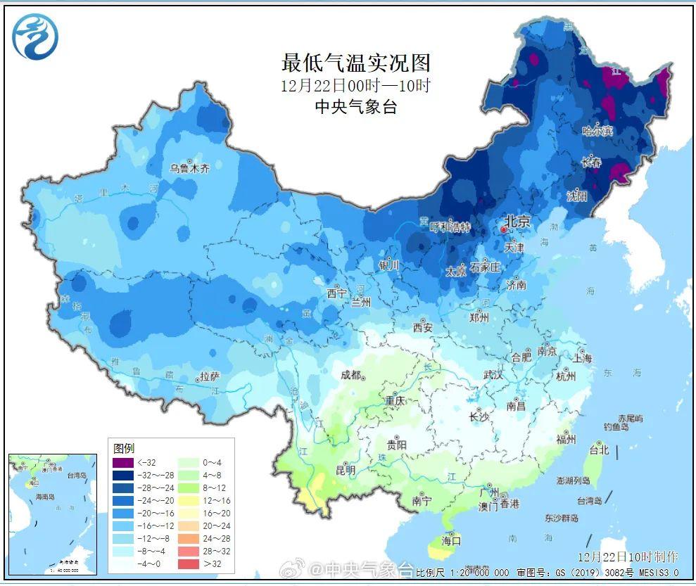 今晨,冰冻线南推至华南北部,中东部尤其是南方大部地区经历了入冬以来最冷的一天。其中海口11.2℃,福州3.5℃,广州3.3℃,昆明3.1℃,南昌-3.5℃,长沙-3.8℃,上海-5.1℃,杭州-5.4℃,武汉-7.4℃,西安-8.9℃,南京-9℃,合肥-11.7℃,太原-23℃。