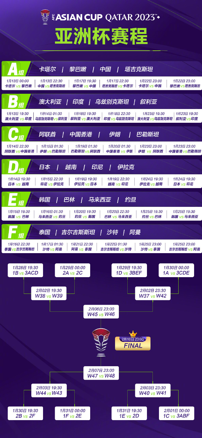 亚洲杯完整赛程公布!国足1月13日首战塔吉克斯坦