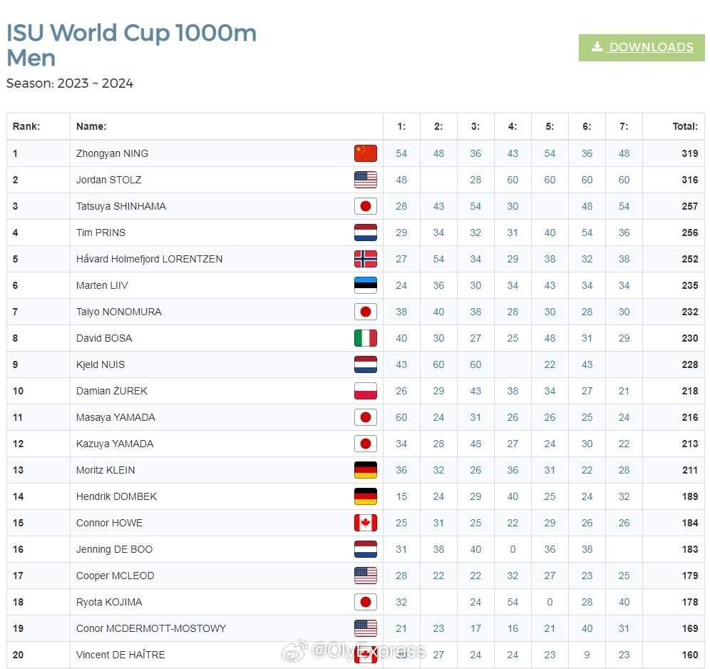 宁忠岩在本赛季的七站世界杯赛中发挥稳定,在1000米项目共获得2银2铜、1个第四和2个第五,并最终斩获总冠军。