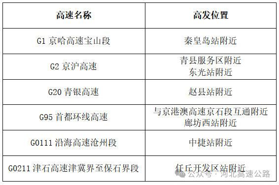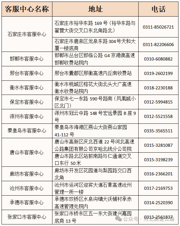 广大司乘朋友可通过关注“河北高速路况信息”抖音号、“河北高速公路”微信公众号、“河北高速集团指挥调度中心”微信视频号、“河北高速集团指挥调度中心”新浪微博、河北省高速公路出行信息服务网(hebecc.com、hb96122.com、hebecc.cn)或拨打河北省高速客服热线96122、收听广播(中国交通广播FM101.2、河北交通广播电台FM99.2、河北新闻广播FM104.3)等方式了解河北高速公路实时路况信息。