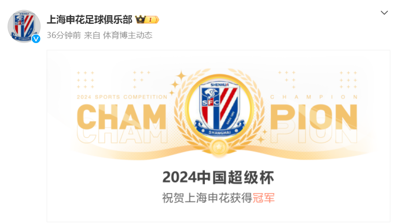 据@上海申花足球俱乐部 消息,2月25日下午,在上海虹口足球场,上赛季中超冠军上海海港队迎战足协杯冠军、同城对手上海申花。最终,申花1-0击败海港,第四次拿下超级杯冠军。