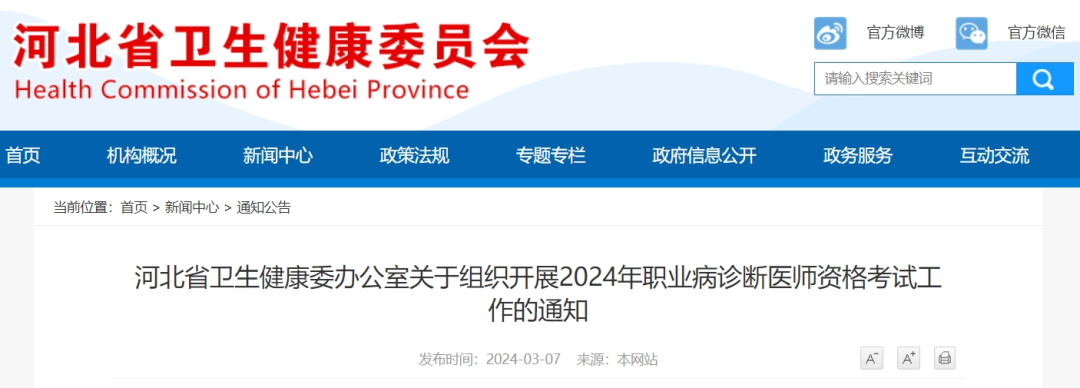 河北省卫生健康委办公室关于组织开展2024年职业病诊断医师资格考试工作的通知