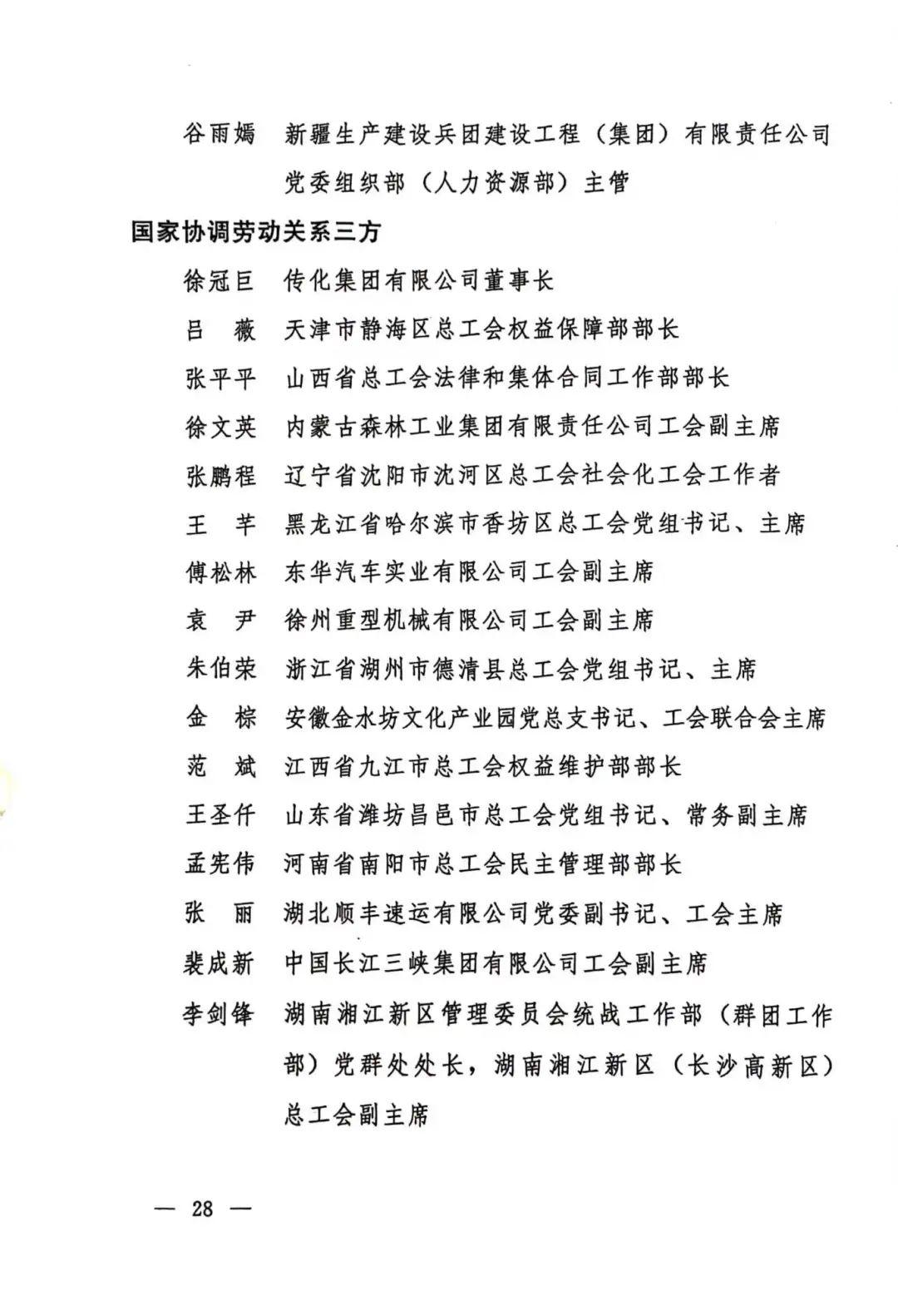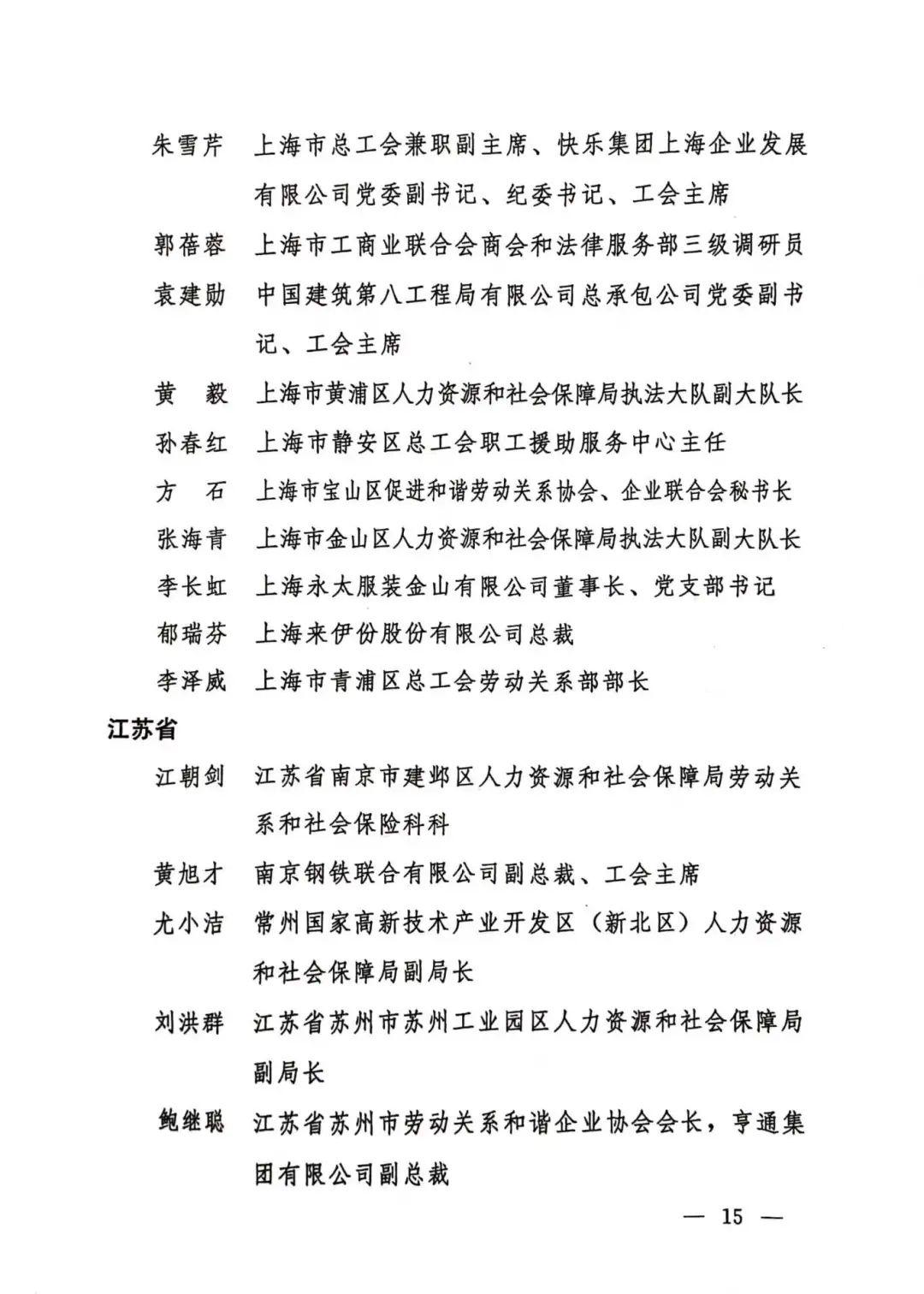 为表彰先进典型,弘扬和谐文化,传递温暖与力量,激励各方满腔热忱团结奋进新征程、建功立业新时代,根据《全国和谐劳动关系创建工作先进集体和先进个人表彰办法》(人社部发〔2023〕22号),人力资源社会保障部、全国总工会、中国企业联合会/中国企业家协会、全国工商联决定表彰京东集团工会委员会等100个全国和谐劳动关系创建工作先进集体,徐冠巨等299名全国和谐劳动关系创建工作先进个人。