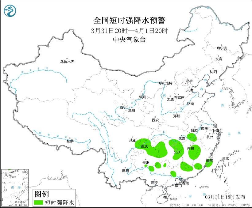 预计3月31日20时至4月1日20时,湖南西部和东北部、江西东部和南部、福建西部、重庆西南部、贵州东部和南部、广西北部、广东东北部等地的部分地区将有8-10级雷暴大风或冰雹天气;此外,安徽西南部、湖北东部和南部、湖南、江西、福建东南部和西部、四川东部、重庆中南部、贵州东北部和南部、广西北部、广东北部等地的部分地区将有短时强降水天气,最大小时雨量30-50毫米,局地可达70毫米以上。
