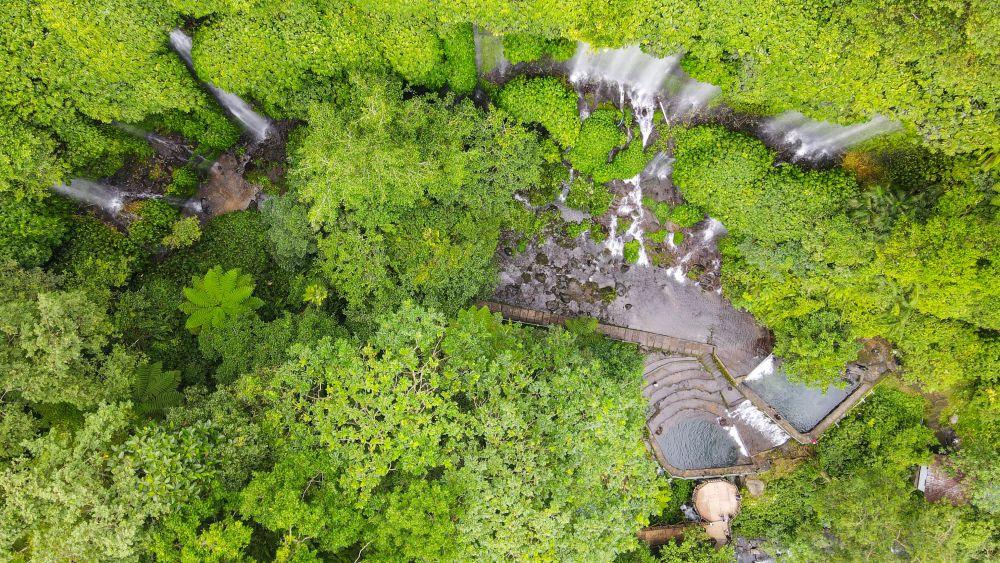这是2022年3月19日拍摄的掩映在热带雨林中的印度尼西亚龙目岛贝南科兰布瀑布(无人机照片)。新华社记者徐钦摄