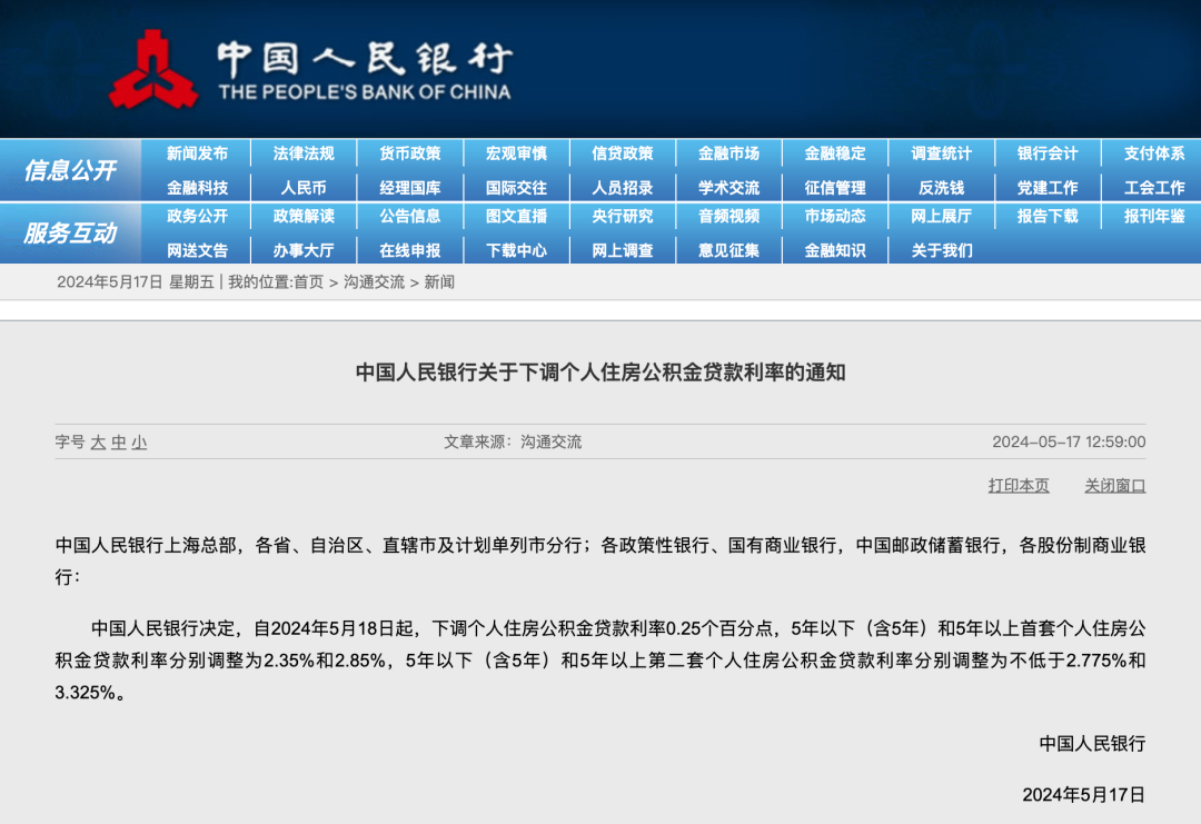 中国人民银行决定,自2024年5月18日起,下调个人住房公积金贷款利率0.25个百分点,5年以下(含5年)和5年以上首套个人住房公积金贷款利率分别调整为2.35%和2.85%,5年以下(含5年)和5年以上第二套个人住房公积金贷款利率分别调整为不低于2.775%和3.325%。
