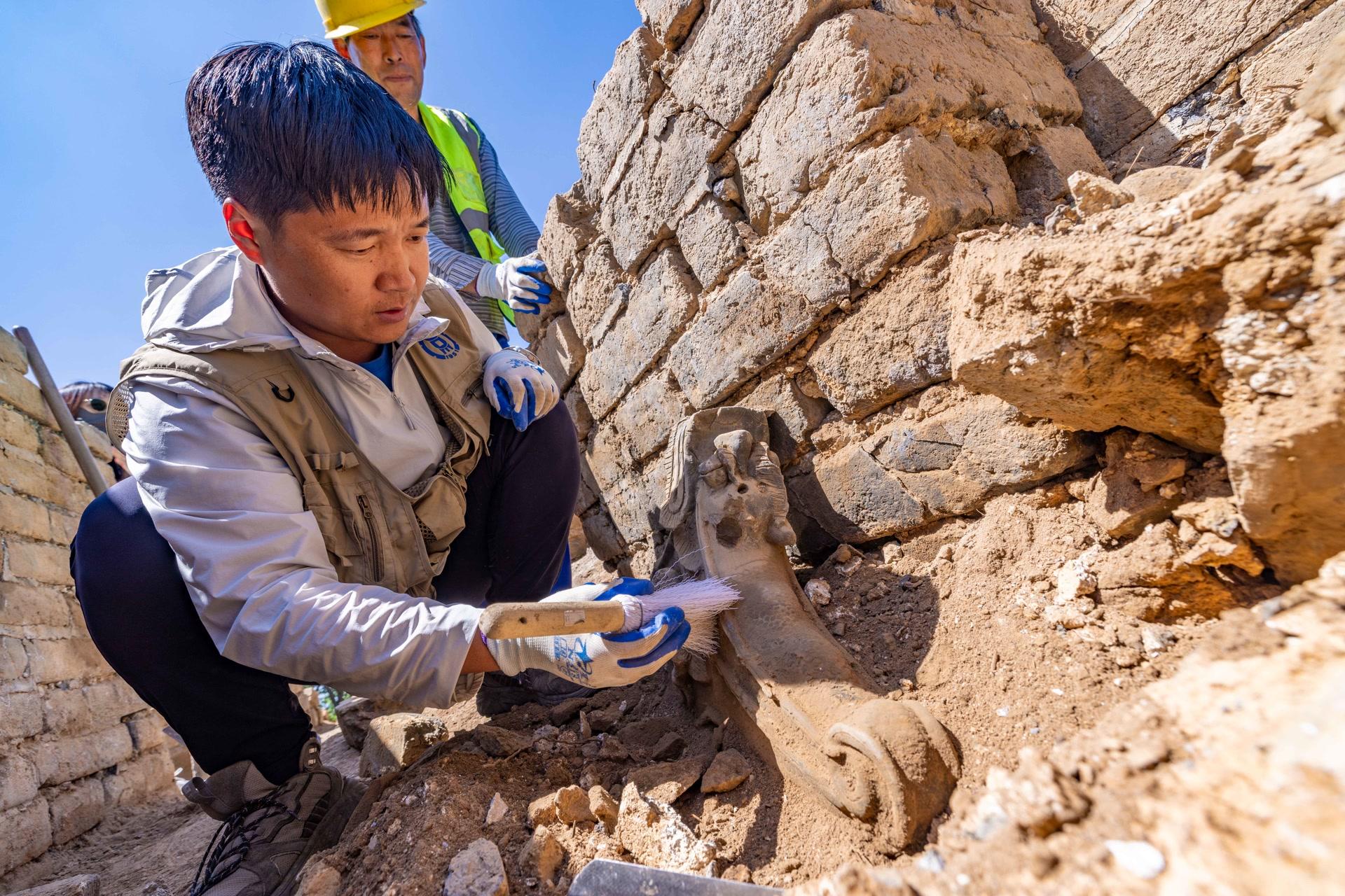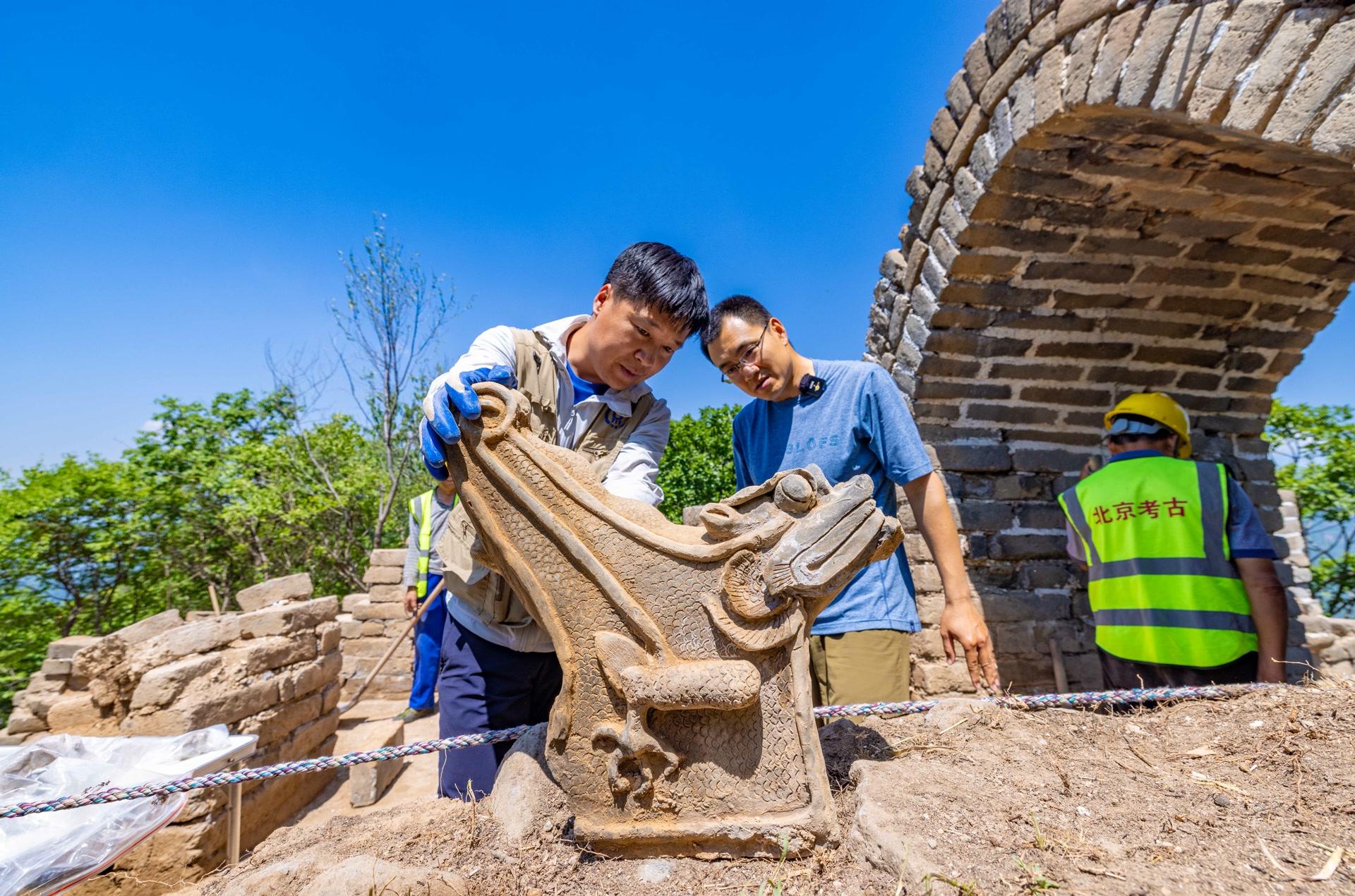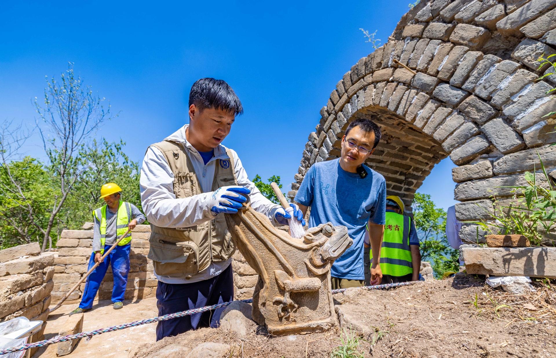 箭扣长城修缮五期项目考古发掘现场,3件明代建筑构件脊兽出土,其中最大的“吻兽”较为罕见,再现长城建筑的精巧结构。