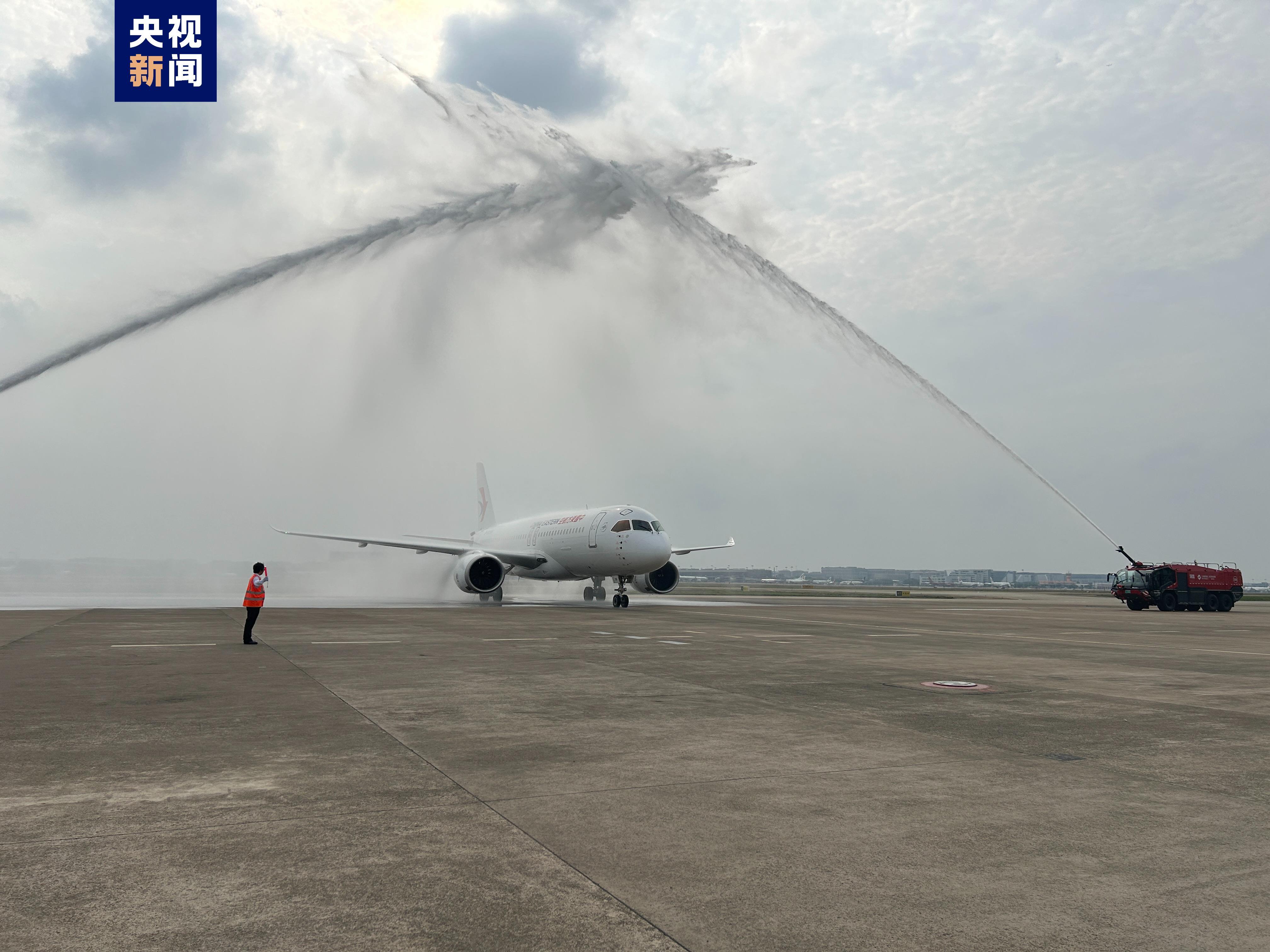 6月1日,C919国产大飞机执飞的首个跨境商业包机从香港起飞后,于15时54分抵达上海,上海虹桥国际机场以“过水门”仪式迎接抵沪的香港青年学子。