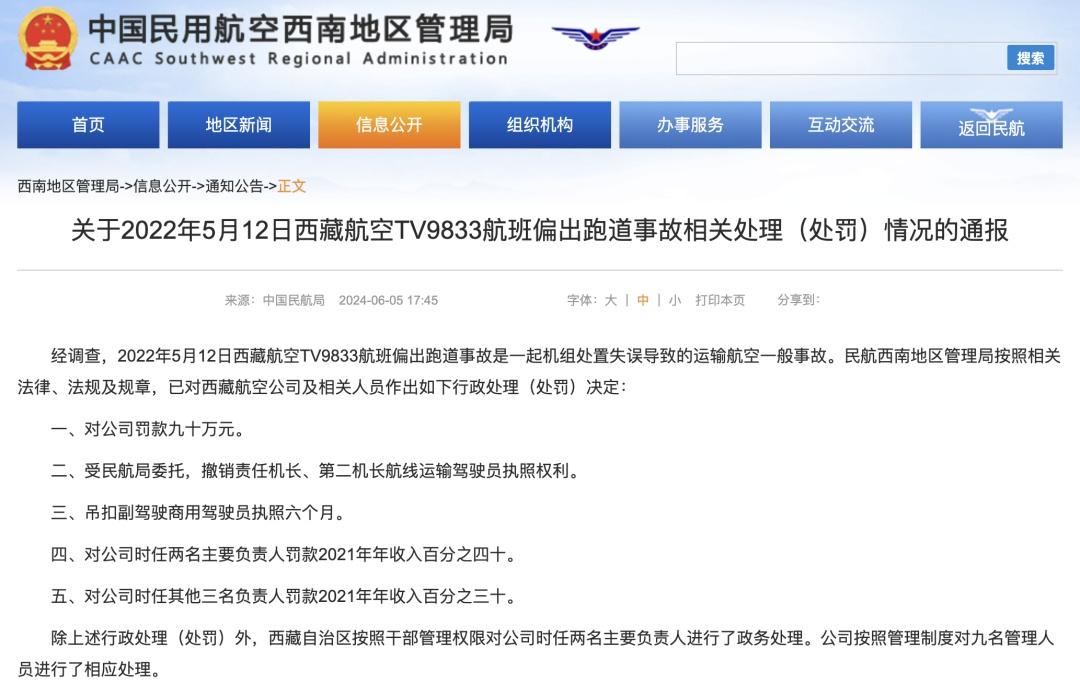 据中国民航局6月5日消息,经调查,该航班偏出跑道事故是一起机组处置失误导致的运输航空一般事故。民航西南地区管理局按照相关法律、法规及规章,已对西藏航空公司及相关人员作出如下行政处理(处罚)决定: