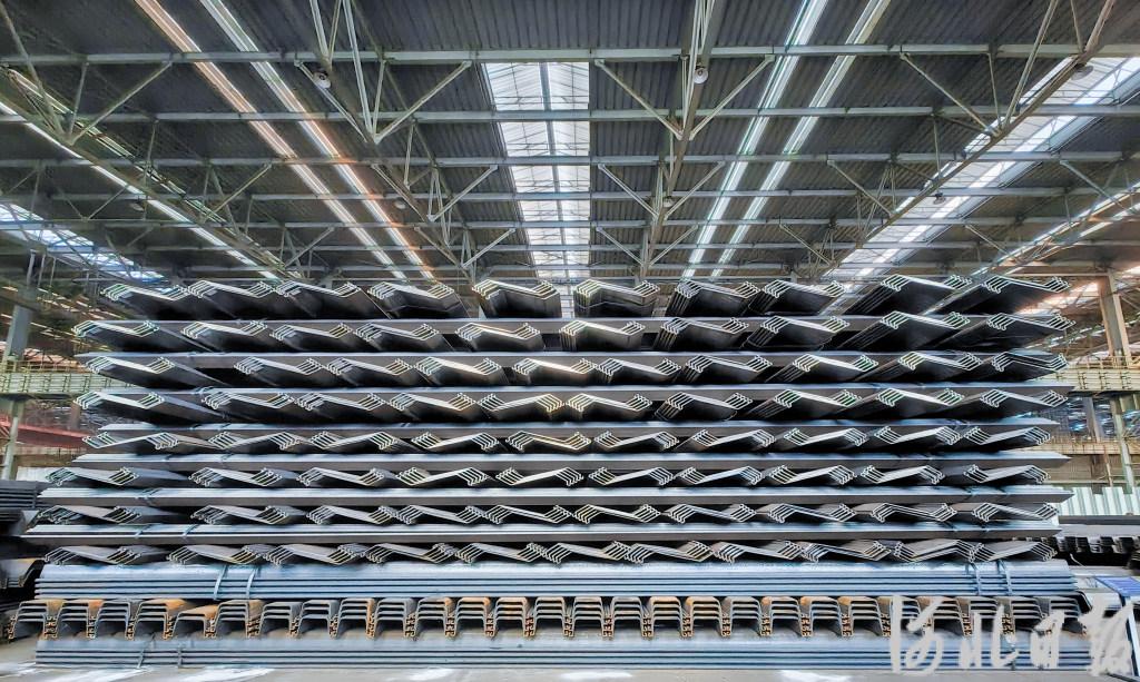 6月27日,在河北津西钢铁集团股份有限公司热轧钢板桩车间成品库,该公司今年新研发的Z型热轧钢板桩整齐码放,等待装运。河北日报通讯员 吴杰 摄
