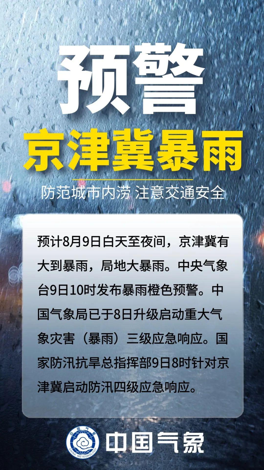 中央气象台预计8月9日白天至夜间,京津冀有大到暴雨,局地大暴雨。中央气象台9日10时继续发布暴雨橙色预警。中国气象局已于8日升级启动重大气象灾害(暴雨)三级应急响应。国家防汛抗旱总指挥部9日8时针对京津冀启动防汛四级应急响应。