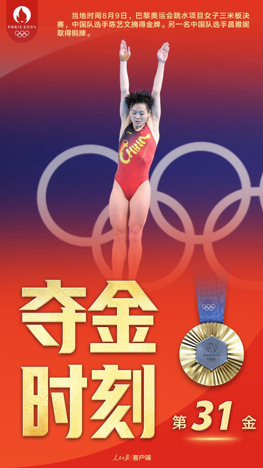 当地时间8月9日,巴黎奥运会跳水项目女子三米板决赛,中国队选手陈艺文摘得金牌。1988 年至今,中国跳水队在该项目上实现奥运十连冠。另一名中国队选手昌雅妮取得铜牌。