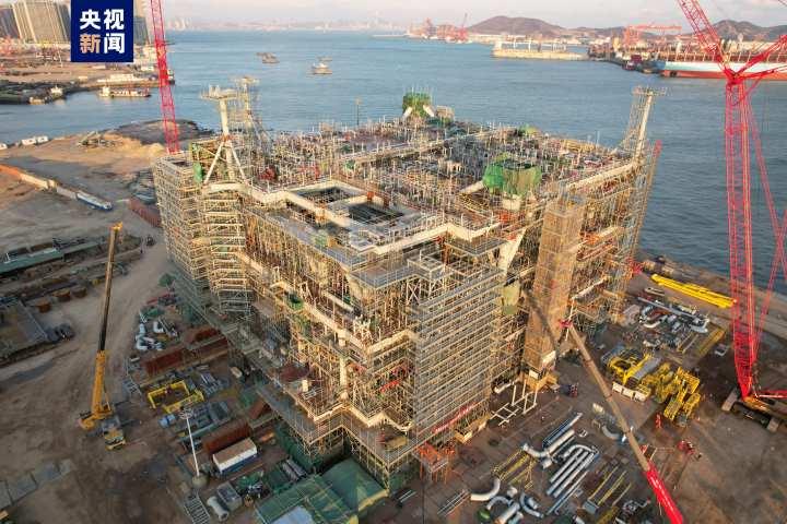 在山东青岛国际化高端装备制造基地,一个重达17000多吨“巨无霸”,是目前在建国际上最大的油气集输平台。经过34个月的施工建造,今天正式交付,月底将搭乘大型运输船,启程前往6400海里以外的海域进行安装。