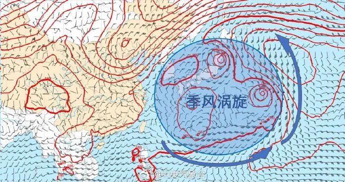 目前随着副热带高压的东退,季风槽重新变得活跃——存在多个热带气旋系统,以及长长一串的季风云系,恰好又形成了季风涡旋系统。出现这种天气形势说明:第一,台风要迎来爆发增长期;第二,台风路径“反常”。