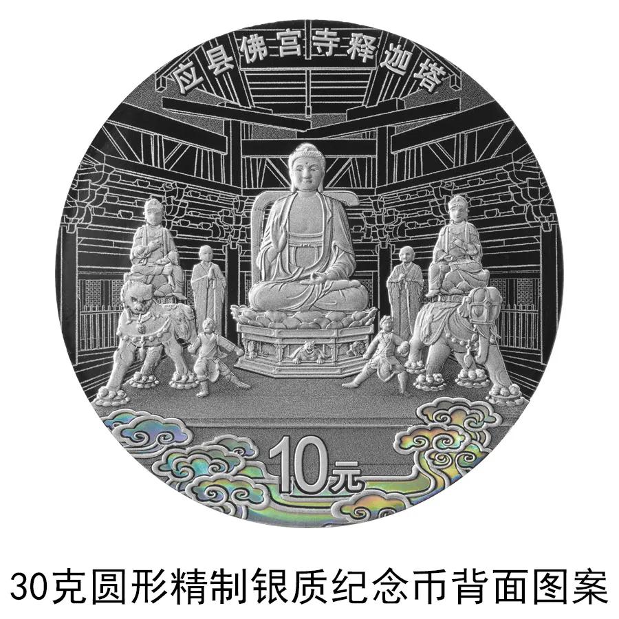 30克圆形银质纪念币背面图案为应县佛宫寺释迦塔内第四层造像全景,辅以祥云、塔内结构局部等组合设计,并刊“应县佛宫寺释迦塔”字样及面额。