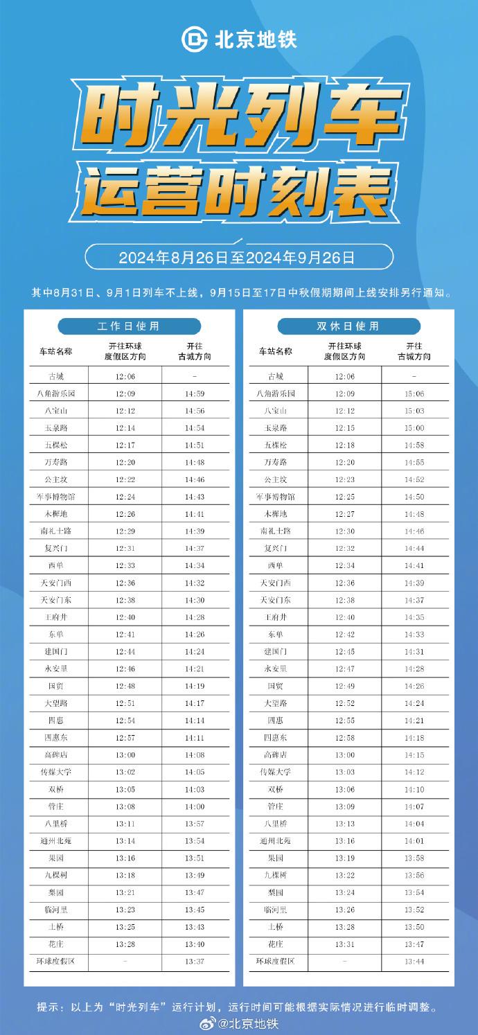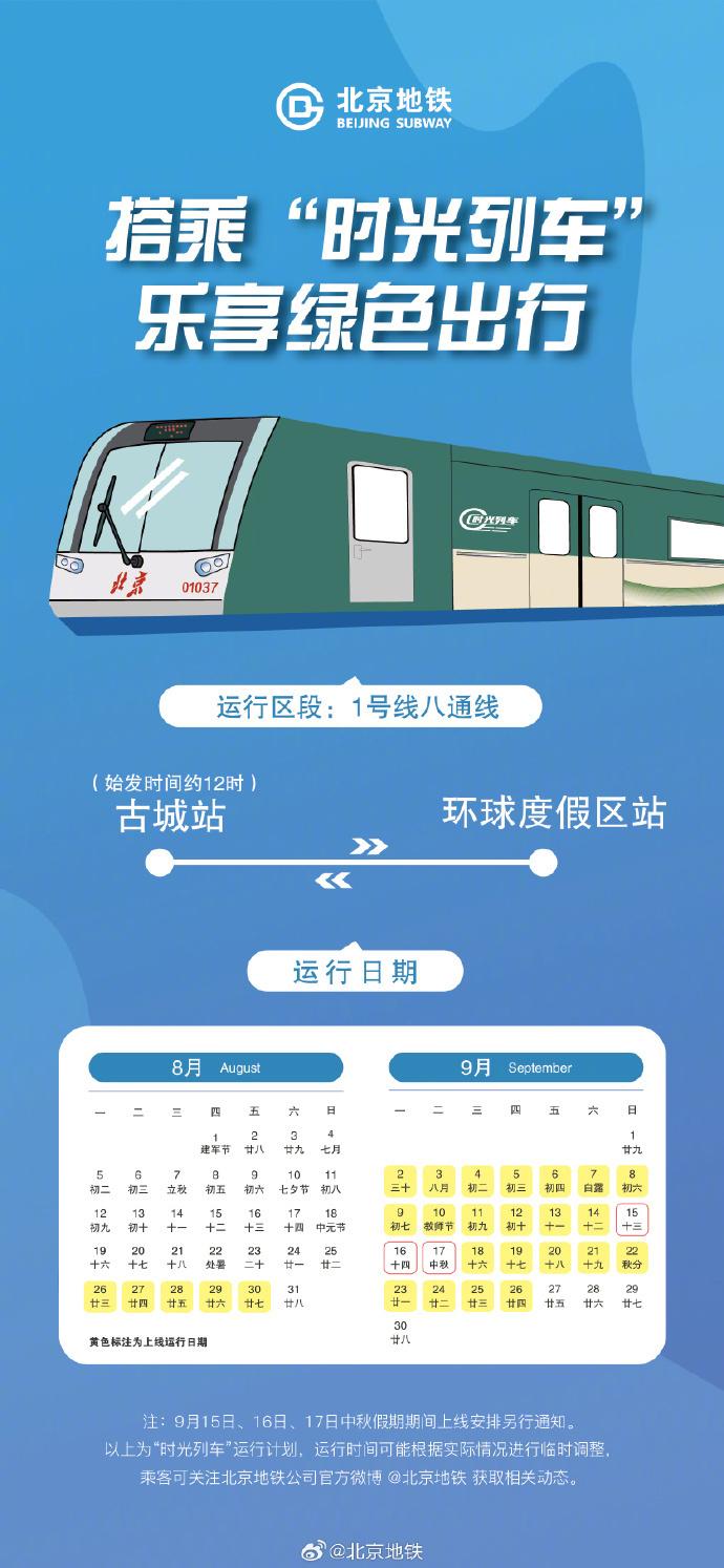 据北京地铁官博消息,经过多项整备和调试,8月26日(周一)起“时光列车”将再次上线运营。新一阶段运营周期为8月26日至9月26日,具体上线日期及运行时刻表详见下图。此次上线的 “时光列车”车厢内张贴了1号线八通线沿线周边博物馆、公园等打卡地出行指引海报,您可通过扫描车厢内的海报二维码了解具体出行指引信息。