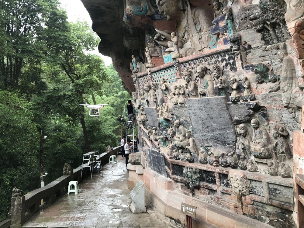 游戏制作团队在大足石刻进行数据采集工作。(大足石刻研究院供图)