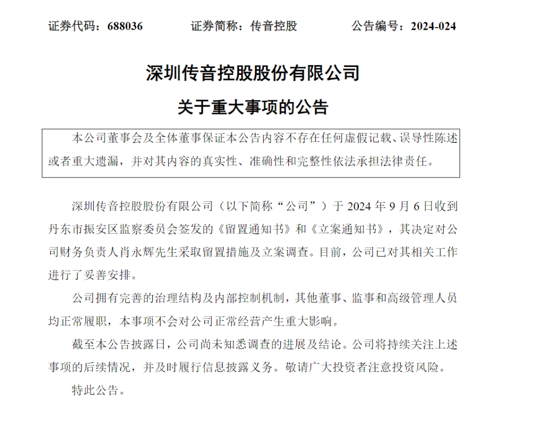 9月6日晚间,传音控股公告,公司收到丹东市振安区监察委员会签发的《留置通知书》和《立案通知书》,其决定对公司财务负责人肖永辉采取留置措施及立案调查。目前,公司已对其相关工作进行了妥善安排。