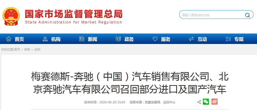 9月20日,市场监管总局网站发布汽车召回公告,梅赛德斯-奔驰(中国)汽车销售有限公司、北京奔驰汽车有限公司召回部分进口及国产汽车。