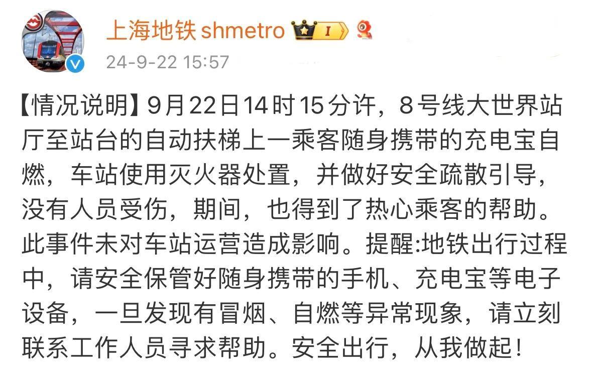 9月22日,上海地铁一乘客乘扶梯时,随身携带的充电宝突然自燃,随后车站工作人员使用灭火器处置,所幸无人员受伤。