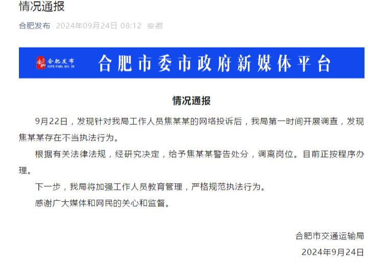 合肥市交通运输局9月24日通报,9月22日,发现针对交通运输局工作人员焦某某的网络投诉后,交通运输局第一时间开展调查,发现焦某某存在不当执法行为。根据有关法律法规,经研究决定,给予焦某某警告处分,调离岗位。目前正按程序办理。