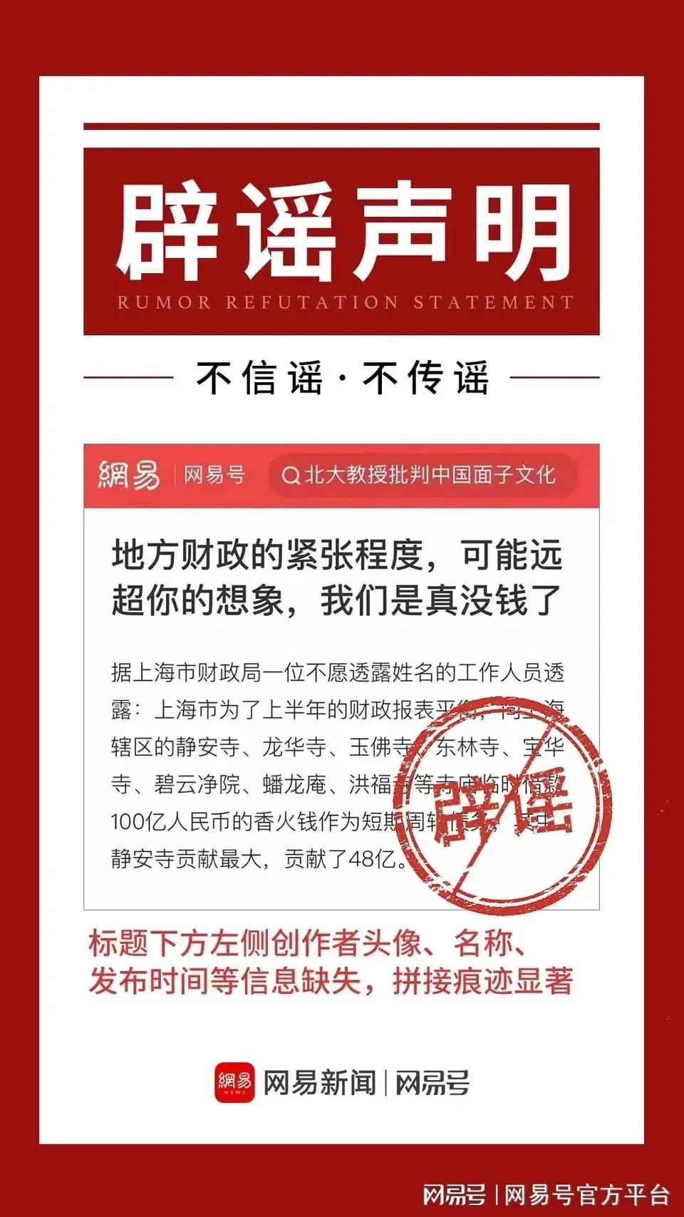近期,一张所谓“上海财政紧张向寺庙借款100亿”的文字图片在各大网络平台快速传播,引起网民广泛关注,一度登上热搜。相关部门反映,这纯属子虚乌有之事。