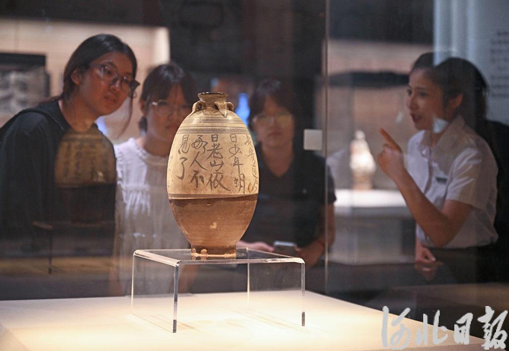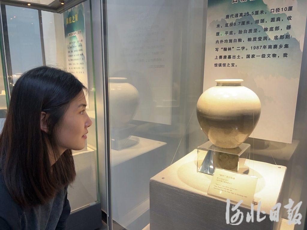 9月14日,一名游客在内丘县的邢窑博物馆参观邢瓷展品“翰林罐”。柳梦珂摄
