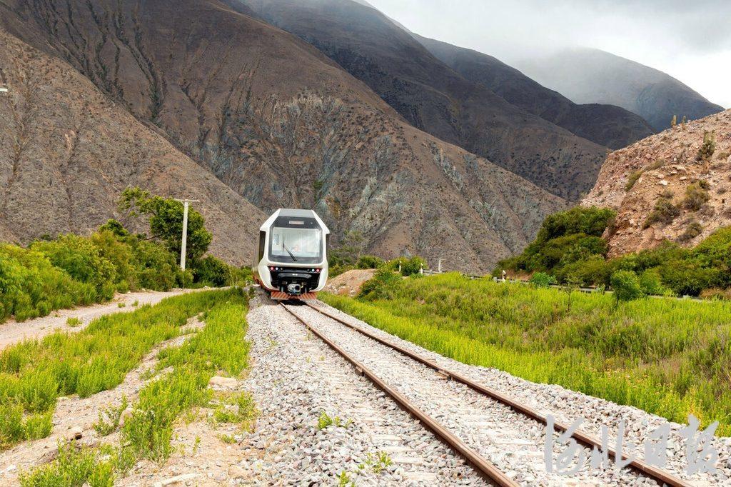 中车唐山公司研制的新能源轻轨列车行驶在阿根廷胡胡伊省乌马瓦卡谷。(资料片)殷玉果摄