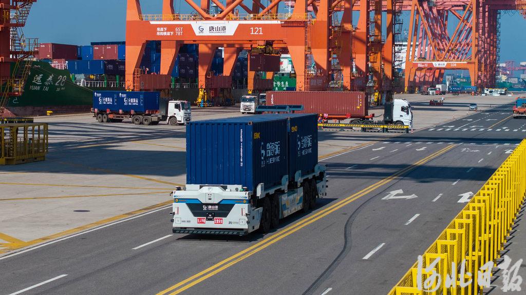 7月16日,唐山港京唐港区,新一代重型智能平板运输车在码头上穿行。河北日报记者 赵杰摄