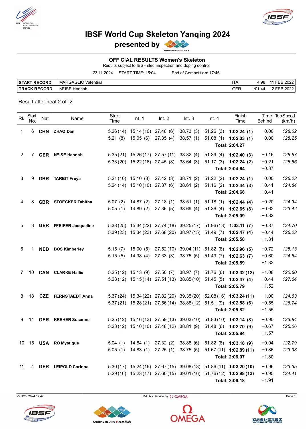 11月23日,在2024国际雪车联合会钢架雪车世界杯延庆站女子钢架雪车比赛中,中国选手赵丹以2分04秒27的成绩夺得冠军,从而成为中国首位女子钢架雪车世界杯冠军。