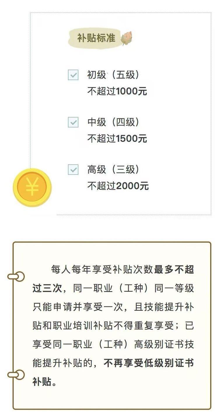 根据规定,参加失业保险1年以上企业的在职职工或者领取失业保险金人员,取得初级(五级)、中级(四级)、高级(三级)技能人员职业资格证书或职业技能等级证书的,可每人分别按照最高1000元、1500元、2000元的标准申领技能提升补贴。
