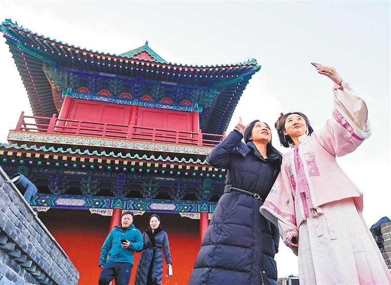 12月25日,游客在河北省石家庄市正定古城南城门拍照。