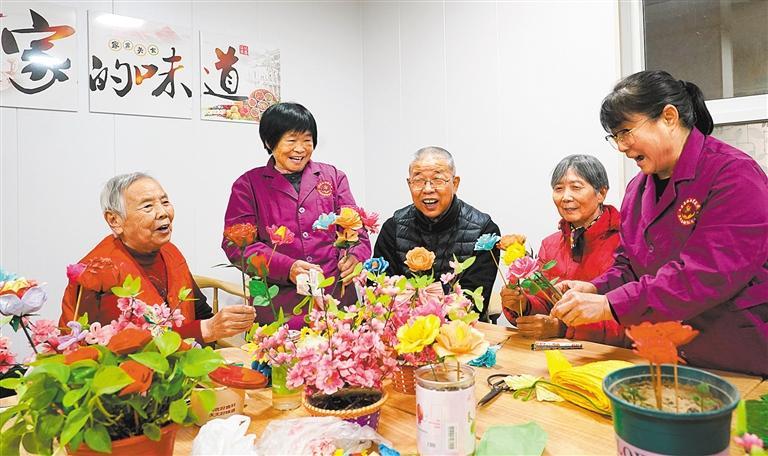 12月25日,正定县塔元庄村劲松养老公寓的老人和工作人员一起制作手工插花。