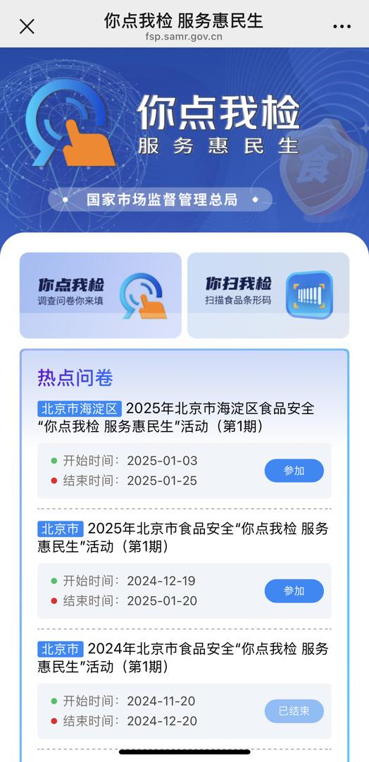 1月2日,市场监管总局推出的全国食品安全“你点我检 服务惠民生”民意征集系统正式上线。人民群众可通过该系统24小时随时点选自己关心关注和希望政府部门抽检的食品,市场监管部门能够实时查看消费者的点选情况,及时掌握老百姓的抽检需求,让“点”有所应,选有所“检”,积极回应人民群众的食品安全关切。