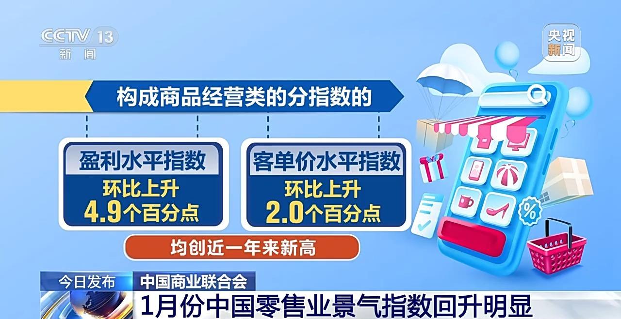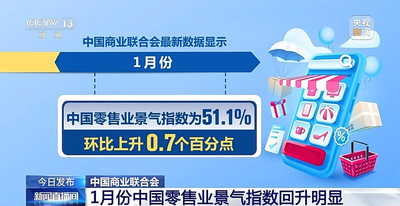 中国商业联合会发布最新数据显示,1月份,中国零售业景气指数为51.1%,环比上升0.7个百分点,同比上升0.2个百分点。其中,商品经营类指数为51.8%,环比上升1.8个百分点;盈利水平和客单价水平指数环比分别上升4.9和2.0个百分点,均创近一年来新高。