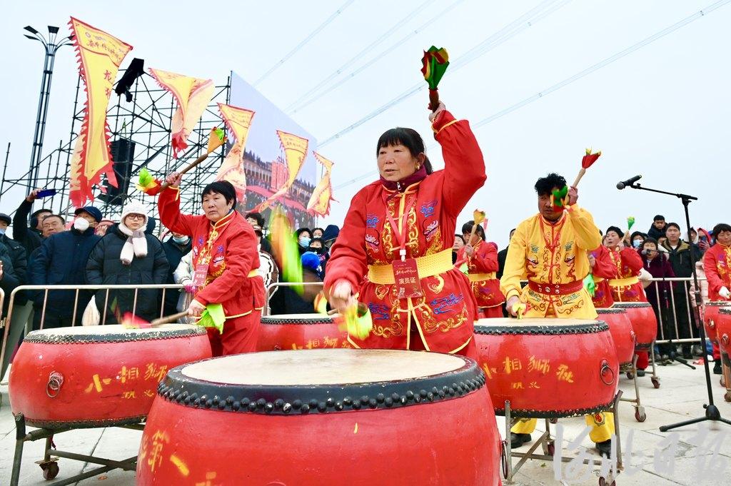 1月31日,“春节·雄安狮舞大会”拉开序幕。图为鼓手正在为游客表演非遗节目。河北日报记者 郝金钰 摄