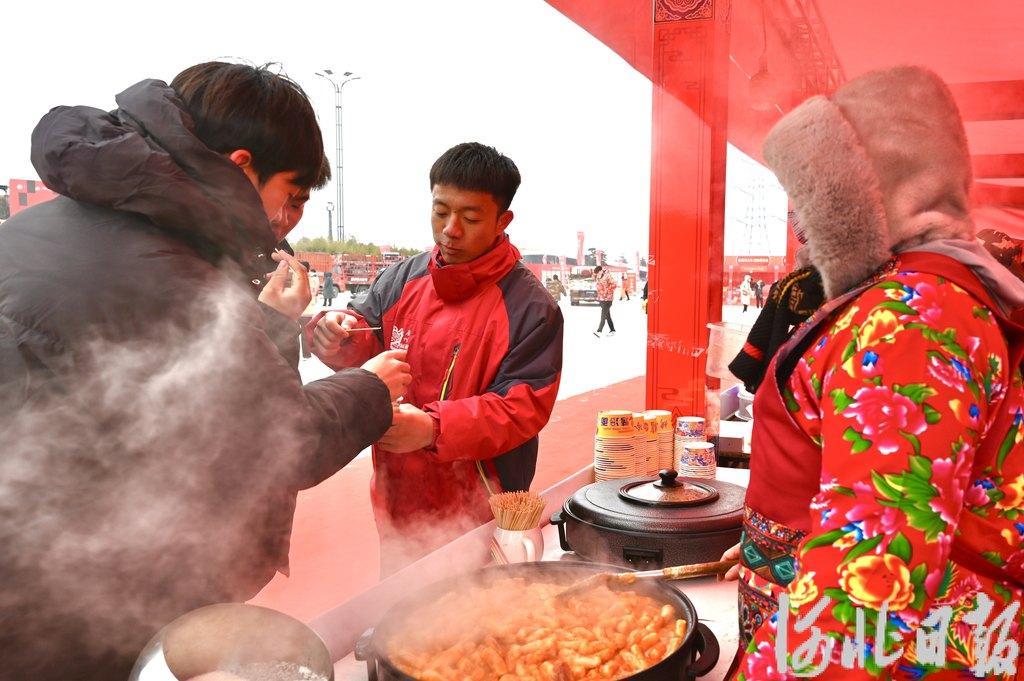 1月31日,在雄安郊野公园内的“春节・雄安狮舞大会”非遗美食区,游客们正在品尝非遗美食。河北日报记者 郝金钰 摄