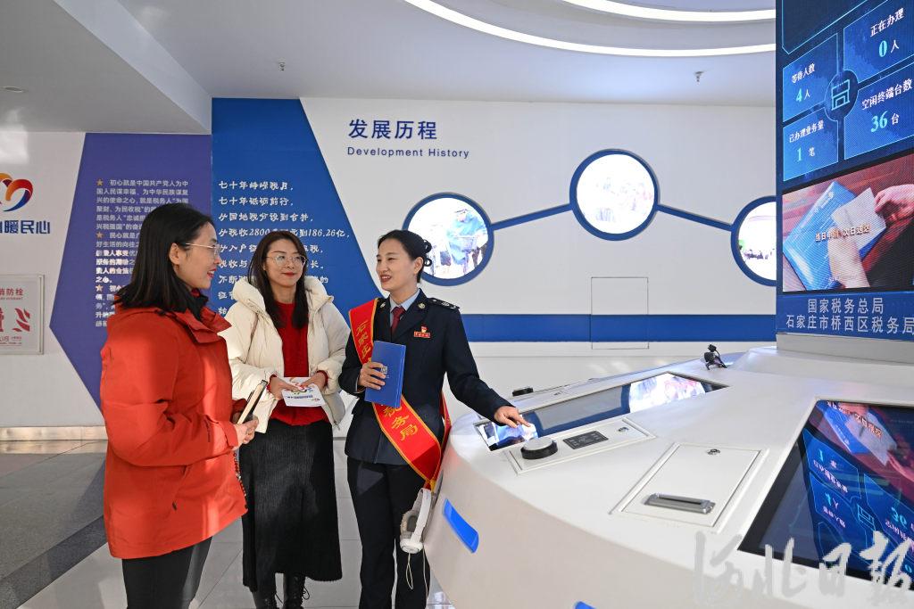 1月26日,石家庄市桥西区税务局工作人员(右一)向企业办事员讲解研发费用加计扣除税收优惠政策。河北日报记者 张昊 摄