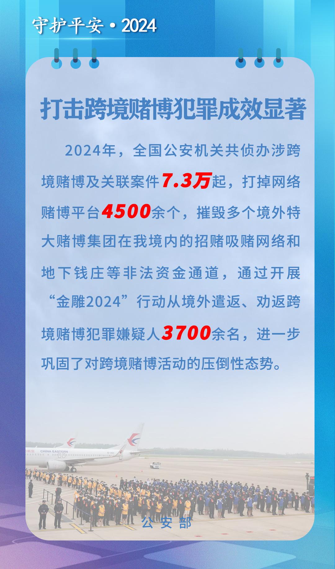 2024年,全国公安机关坚决贯彻党中央决策部署,认真落实全国打击治理跨境赌博工作电视电话会议要求,坚持打防并举、综合施策,集中力量资源,加强协同配合,强力推进打击治理跨境赌博各项工作。截至2024年12月,共侦办涉跨境赌博及关联案件7.3万起,打掉网络赌博平台4500余个,摧毁多个境外特大赌博集团在我境内的招赌吸赌网络和地下钱庄等非法资金通道,进一步巩固了对跨境赌博活动的压倒性态势。
