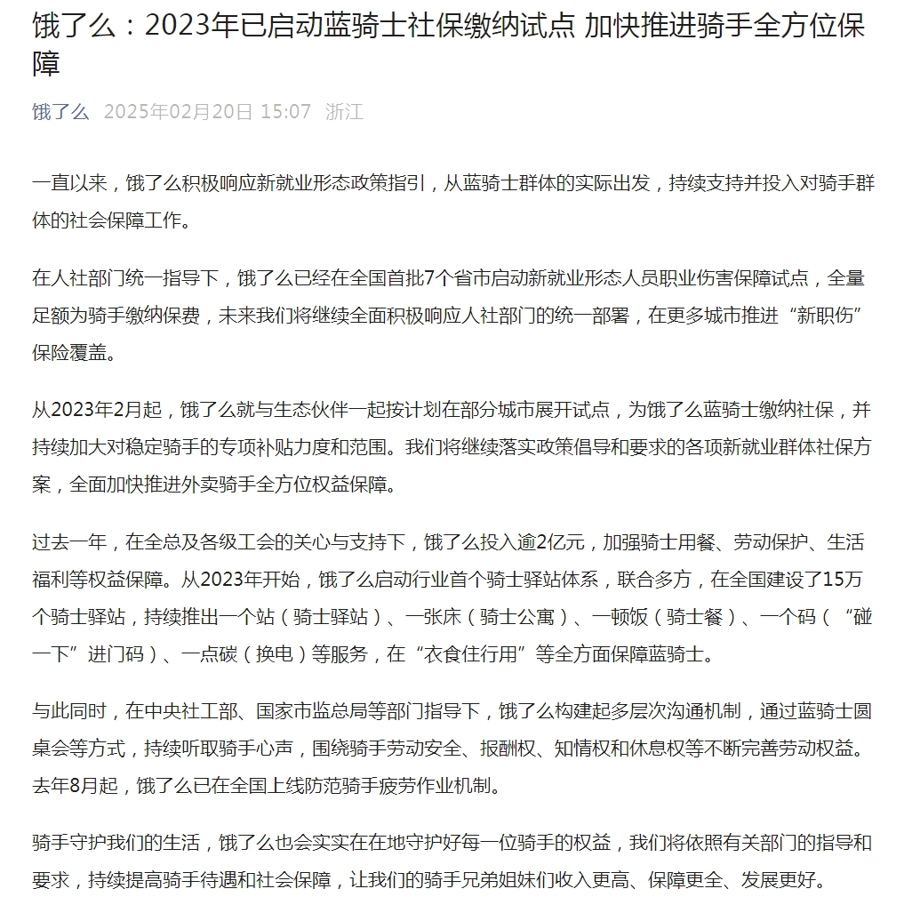 文中称,从2023年2月起,饿了么就与生态伙伴一起按计划在部分城市展开试点,为蓝骑士缴纳社保,并持续加大对稳定骑手的专项补贴力度和范围,全面加快推进外卖骑手全方位权益保障。
