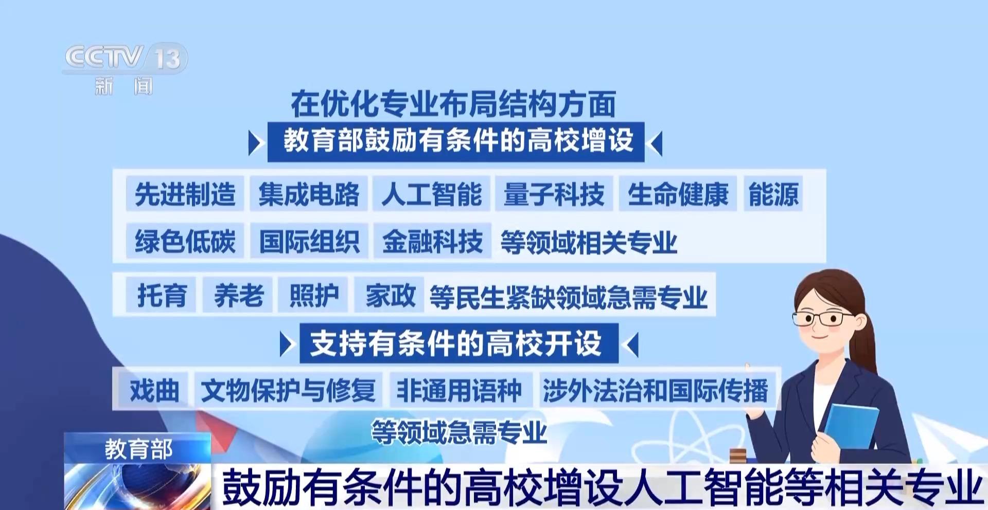 在优化专业布局结构方面,教育部鼓励有条件的高校增设先进制造、集成电路、人工智能、量子科技、生命健康、能源、绿色低碳、国际组织、金融科技等领域相关专业,以及托育、养老、照护、家政等民生紧缺领域急需专业。支持有条件的高校开设戏曲、文物保护与修复、非通用语种、涉外法治和国际传播等领域急需专业。