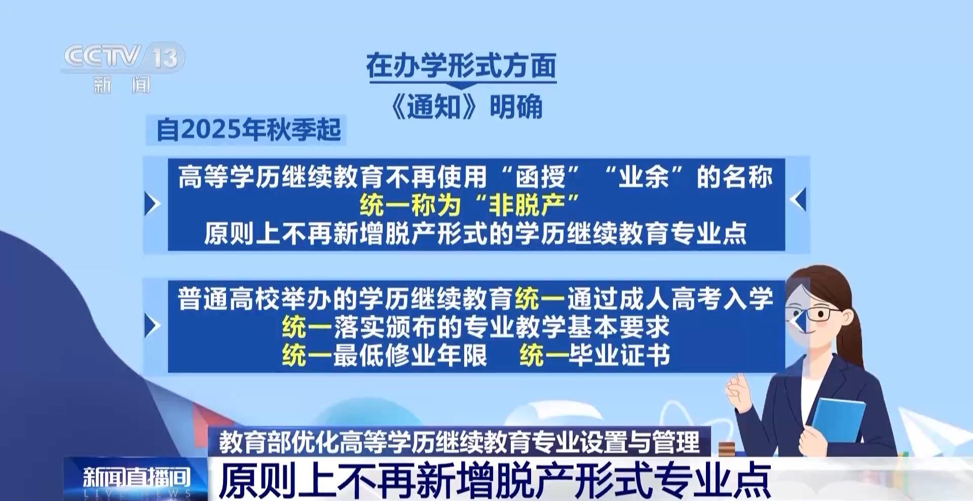 教育部19日印发《关于做好2025年度高等学历继续教育专业和校外教学点设置与管理工作的通知》,要求优化高等学历继续教育的专业设置与管理;2025年秋季起,高等学历继续教育不再使用“函授”“业余”的名称,统一称为“非脱产”。