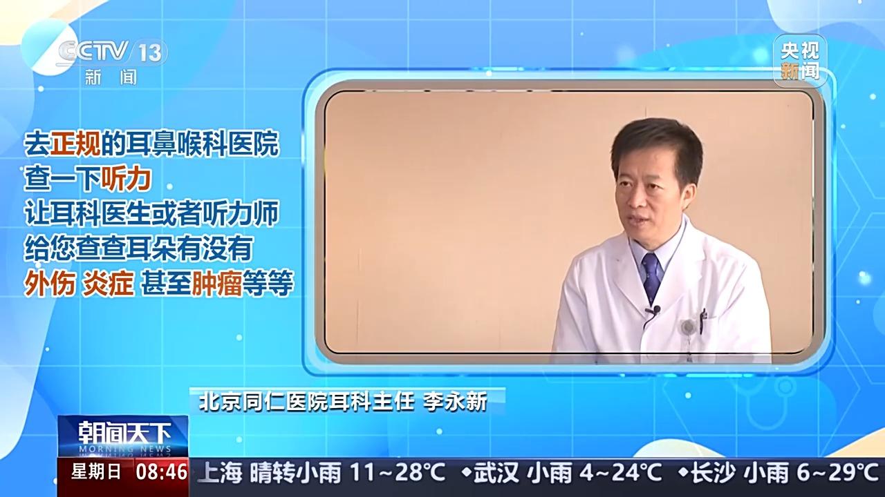 北京同仁医院耳科主任 李永新:去正规的耳鼻喉科医院查一下听力,让耳科医生或者听力师给您查查耳朵有没有什么外伤、炎症,甚至肿瘤等等,及时到医院就诊,及时干预,及时用药,听力康复的概率可能会加大。