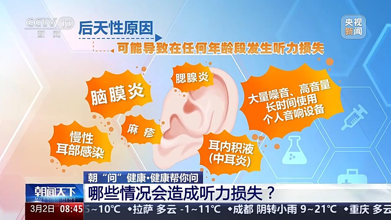 造成听力损失的原因,可能是先天性的,也可能是后天性的。其中,后天性原因可能导致在任何年龄段发生听力损失。包括脑膜炎、麻疹和腮腺炎等传染病,慢性耳部感染,耳内积液(中耳炎),大量噪声、高音量长时间使用个人音响设备等,都会造成后天听力损失。