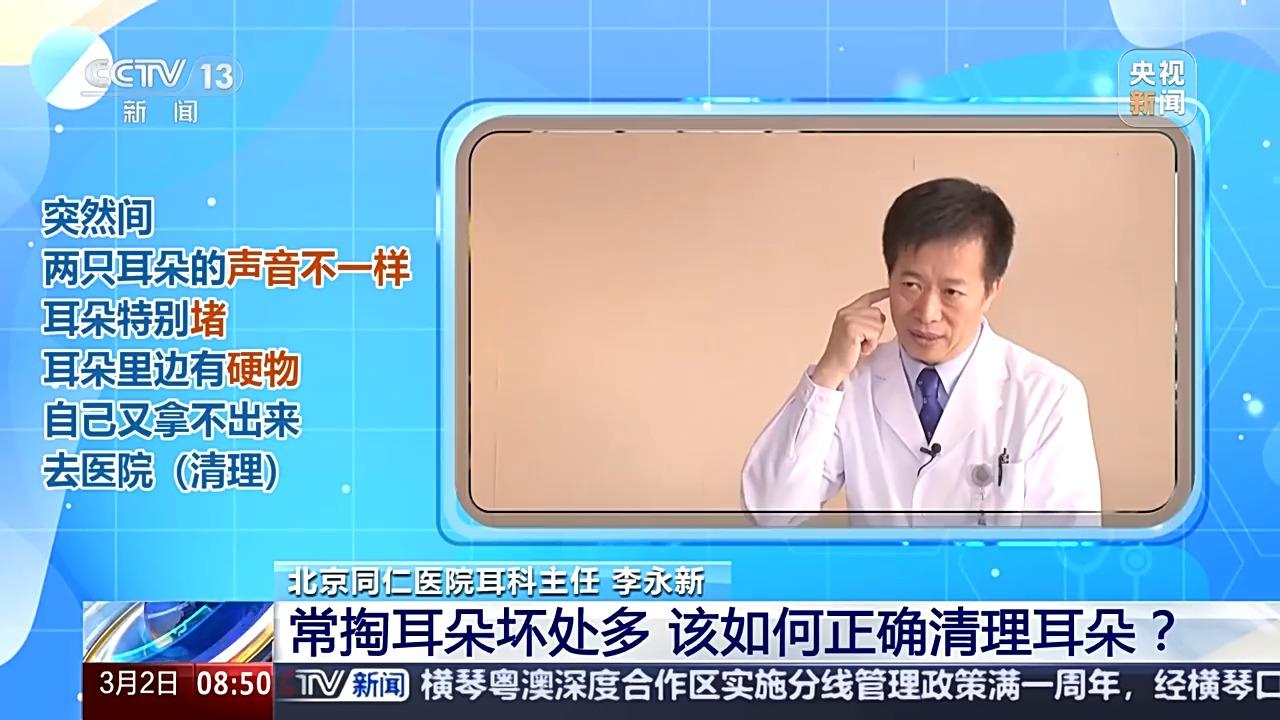 北京同仁医院耳科主任 李永新:比方说我突然间觉得两只耳朵的声音不一样,我觉得这个耳朵特别堵,耳朵里边有个硬物,我自己又拿不出来,这时候你去医院清理,而除此之外,两边声音都可以,一般的耵聍你不用管它。尤其我们年轻人好动,吃东西也比较用力,你这活动咀嚼、下颌关节的运动,都会把这耵聍自动排出来,不要特别干预它。(李斌 孔冰冰)