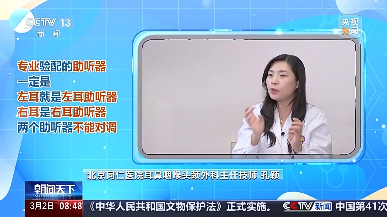 北京同仁医院耳鼻咽喉头颈外科主任技师 孔颖:正常的两个耳朵听力都不完全一样,何况听力损失的患者,我们真正专业验配的助听器一定是左耳,就是左耳助听器,右耳是右耳助听器。我们在跟患者讲解的过程中告诉他,两个助听器是不能对调的。
