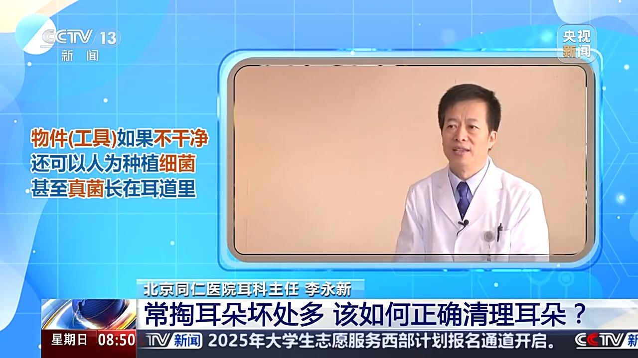 北京同仁医院耳科主任 李永新:每个人的耳道口都有一圈耵聍在附着着,那是耵聍腺分泌的一种物质。这个物质它有保护作用。同时耵聍还有杀菌的作用,我们上耳道的皮肤都有纹理血管,那么你经常掏会导致皮肤血管的增生,让通透性下降,容易患病。当然你掏的物件如果不干净,还可以人为种植细菌,甚至真菌长在你的耳道里,所以清理相应有一个度,过度肯定不对。